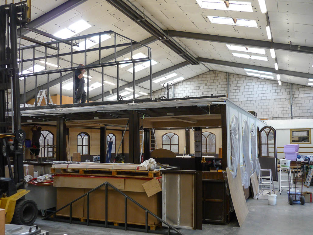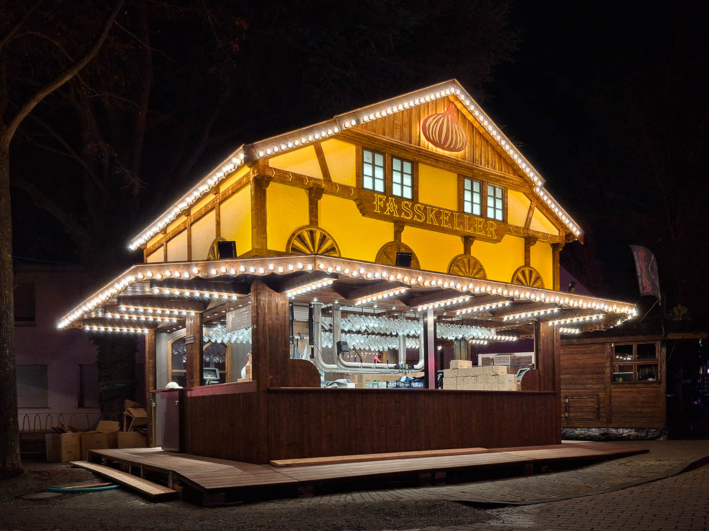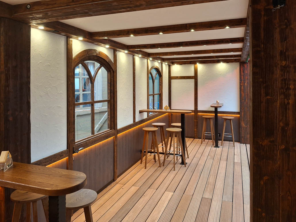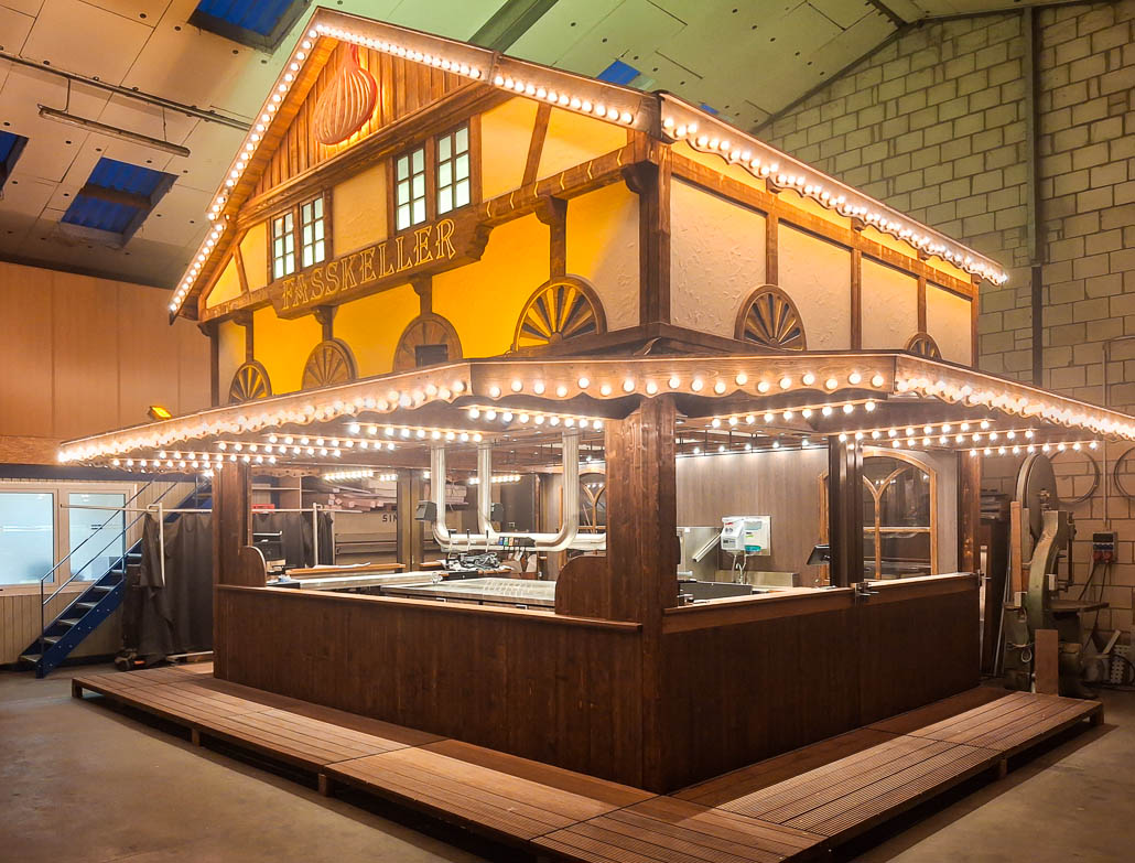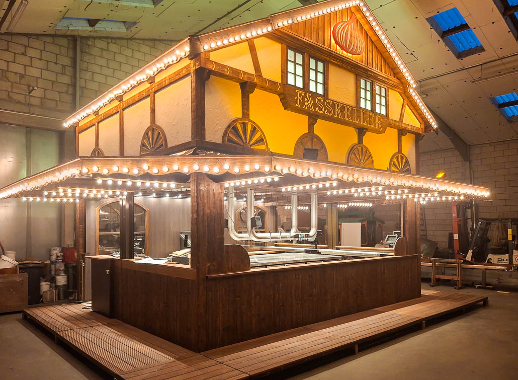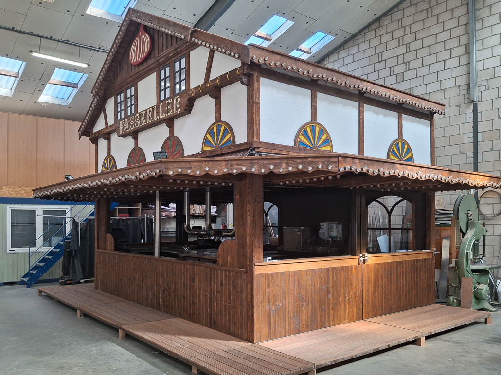 - Variante 1 – Komplettaufbau: Ausschankgeschäft mit Gastraum, ca. 10,0 m breit und 13,5 m tief. frontseitig mit Vordächern, Laufrosten, aufgesetztem Giebel sowie Zeltdach mit Lichtausschnitten.