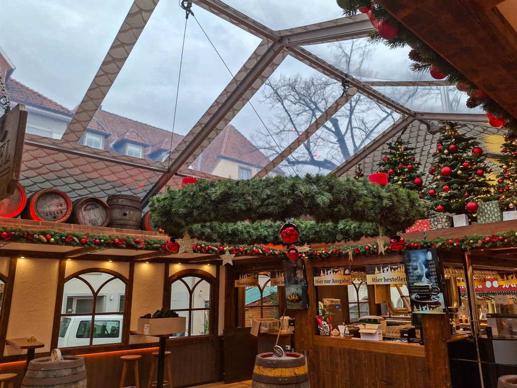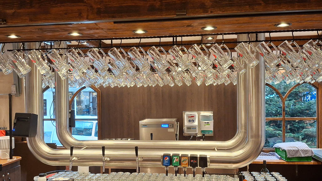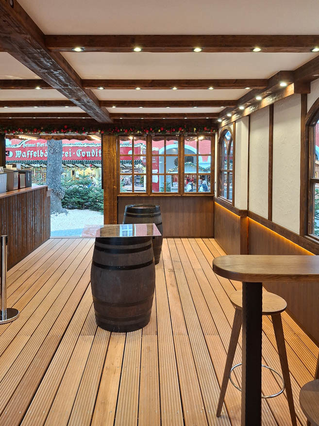 - Variante 2 – Kompaktaufbau: Zwei Container als Ausschank, umlaufend mit eingehängten Vordächern und Laufrosten, aufgestelltem Dachgiebel und seitlichen Dachdrempeln.