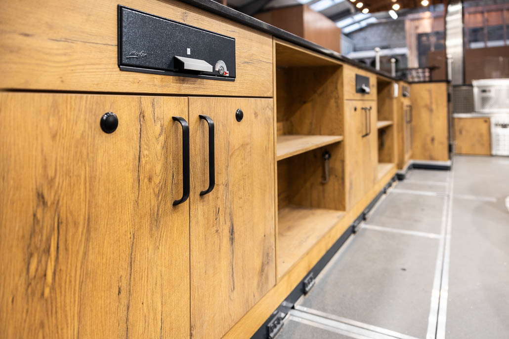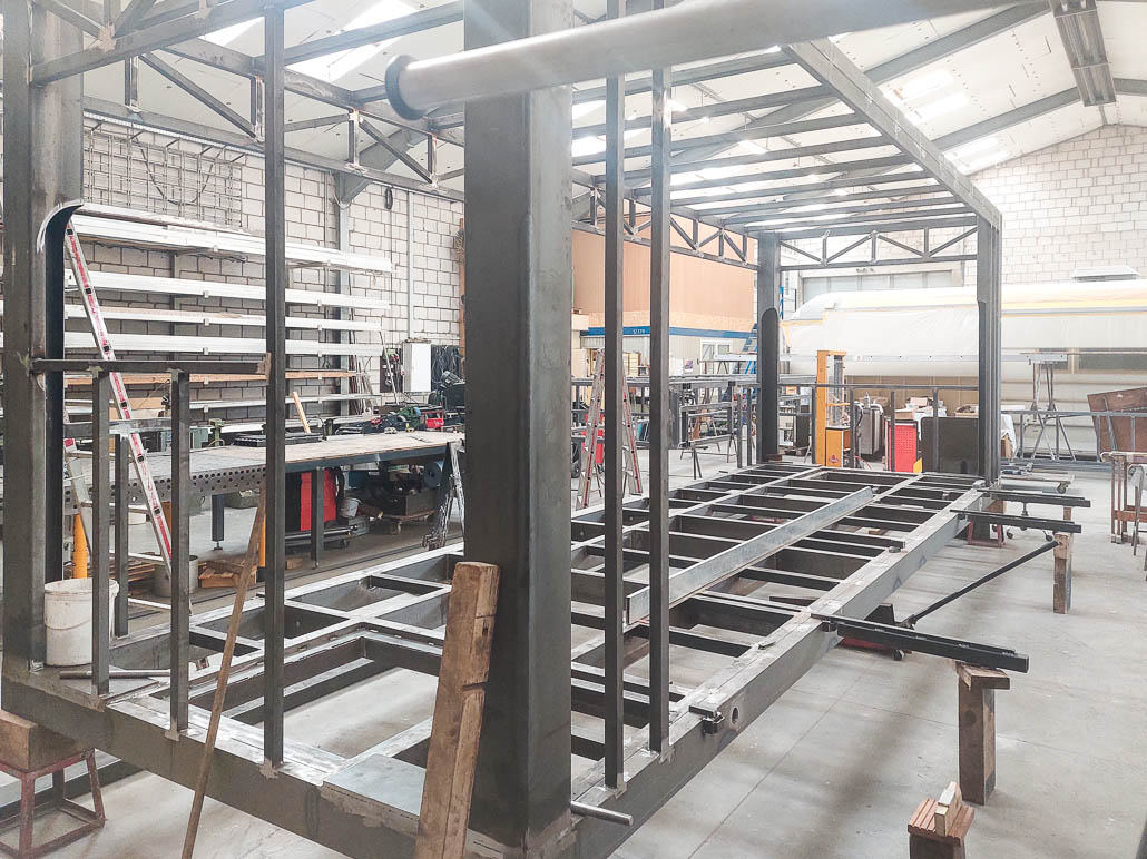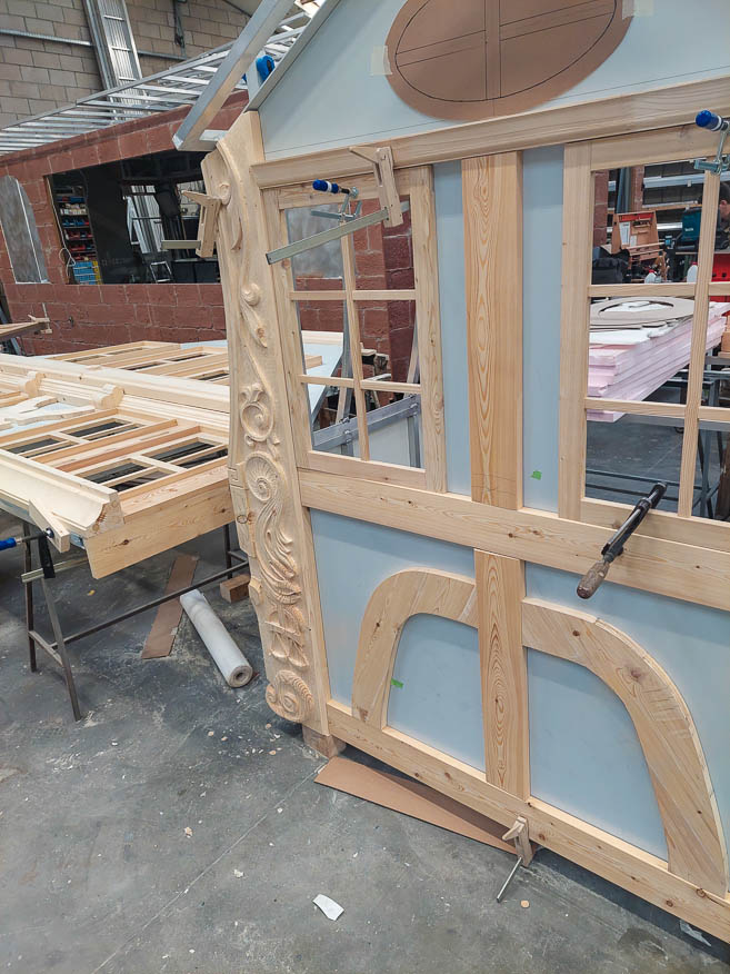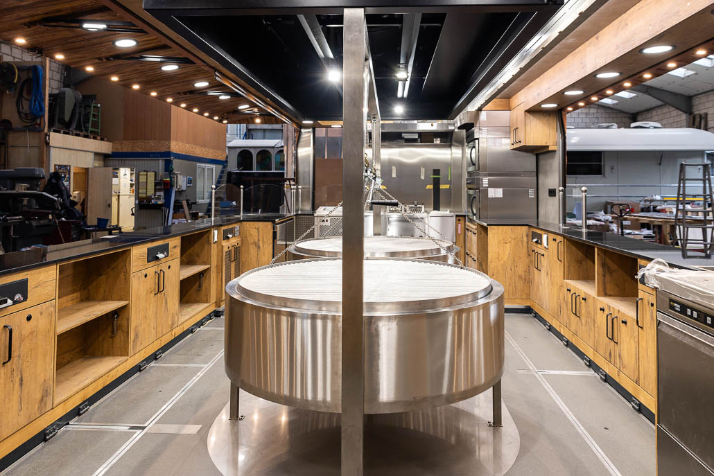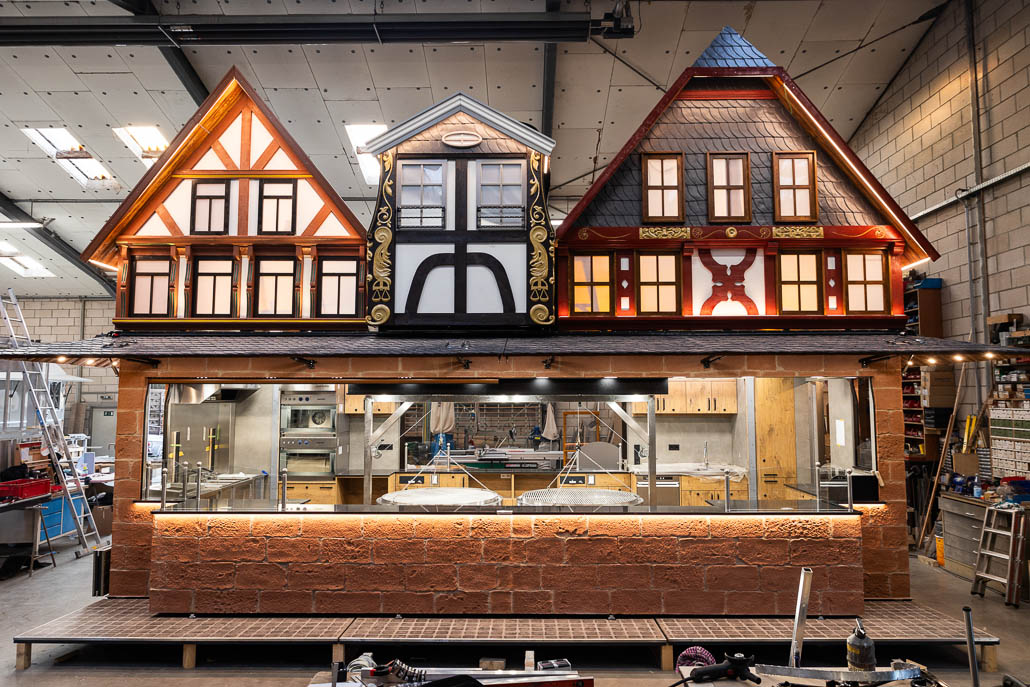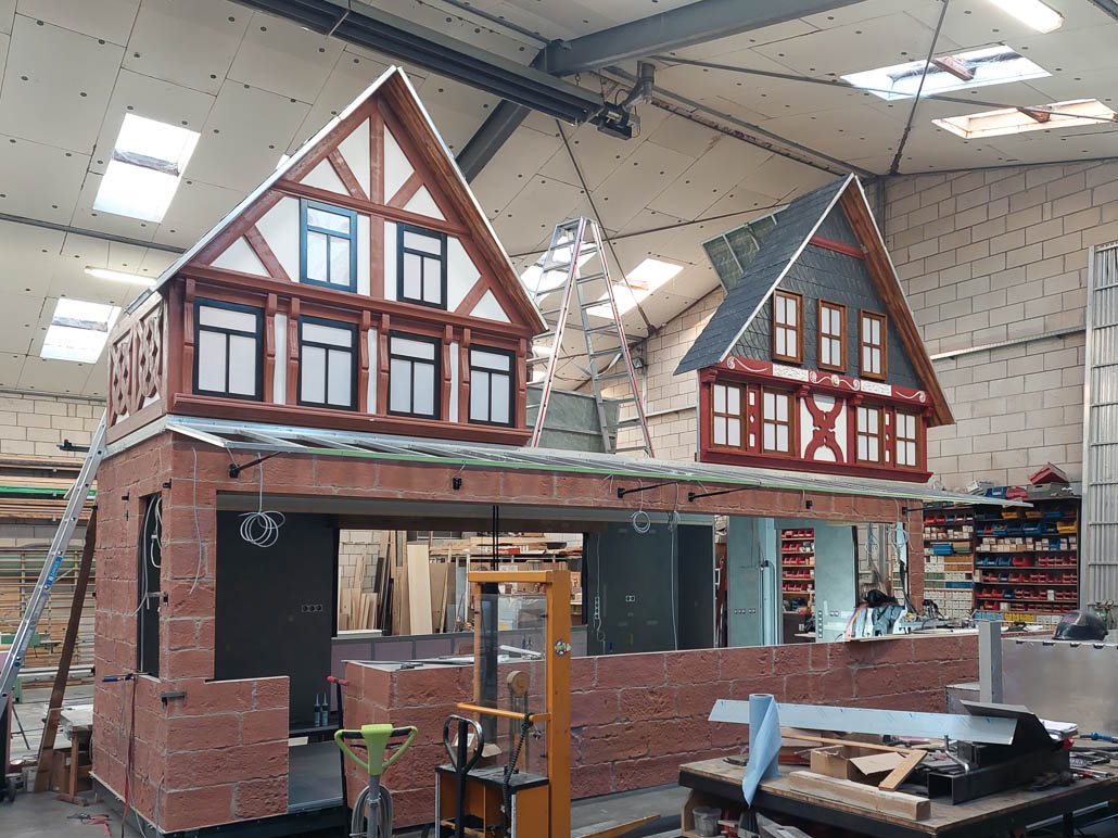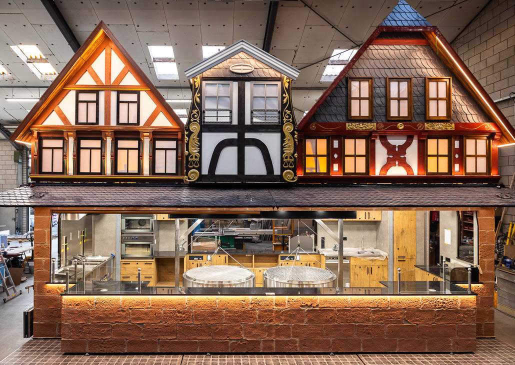Der Imbiss hat ein Aufbaumaß von 9m breite x 5,5 m Tiefe und 6,0 m Höhe. Ausgestattet mit 2 Längserker, hydraulisch abklappbaren Häuserfronten, trennbare Fahrgestelle, umlaufende Vordächer und Laufroste. Die Steinfassade und die Fachwerkfronten sind dem Frankfurter Stadtbild nachempfunden.