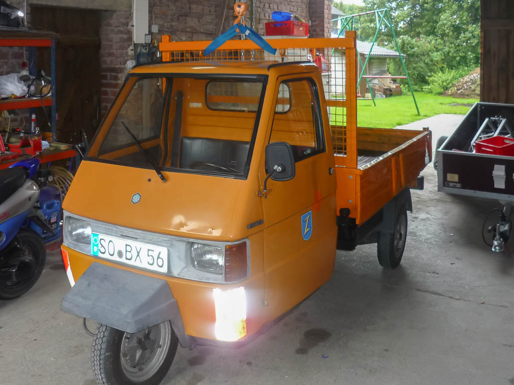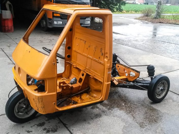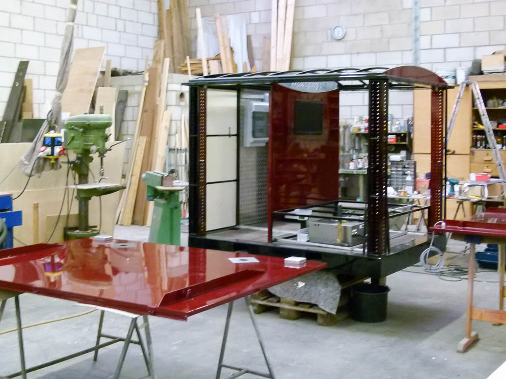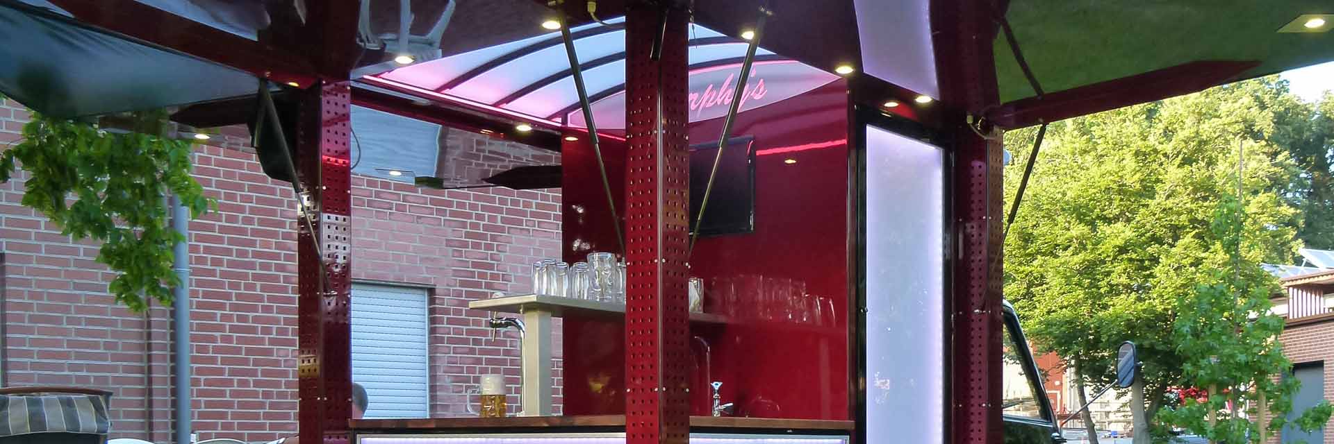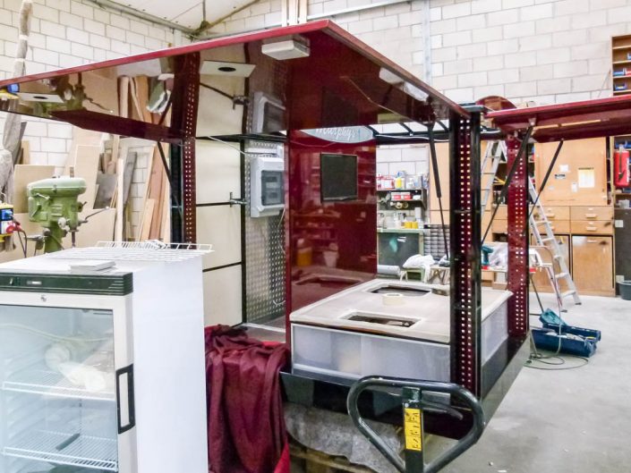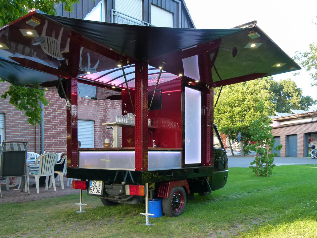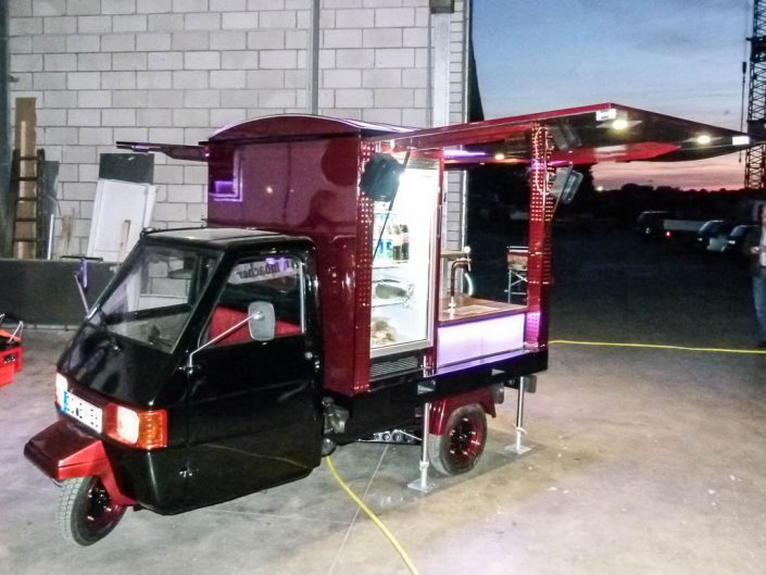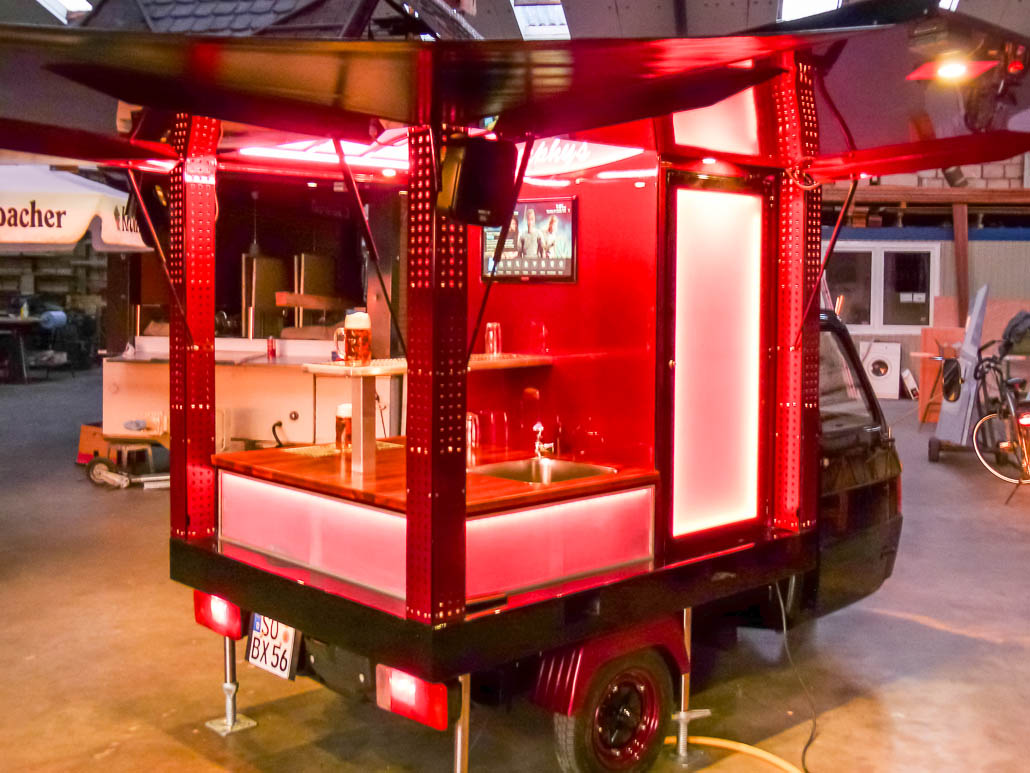 Der Verkaufsaufbau der Ape ist als Wechselcontainer konzipiert. Auf engstem Raum wurde hier viel Technik wie Fernseher, Musikanlage, Durchlaufkühler u.v.m. untergebracht.
